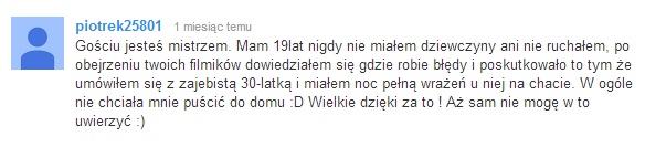 Krzysiek to jest genialne ! Dzięki temu materiałowi zrozumiałem jaki błąd popełniałem zawsze na początku rozmowy z prawie każdą dziewczyną. Ten jeden mały element sprawiał, że dziewczyna traciła mną zainteresowanie (...) Teraz kiedy już wiem co robiłem źle i zastosowałem Twoje porady jestem naprawdę szczęśliwy. Duża ilość podejść wychodzi mi znacznie lepiej. Dziewczyny się cieszą a ja mam ciągle zajęte łóżko:) Piona stary ! Jesteś geniuszem!